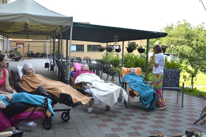 Naše dámy a naši pánové zaujali pohodlnou polohu na lehátkách na terase našeho domova. Vnímali zvuky přírody a nástrojů v jejich přirozeném ladění, který místy doplňoval klidný zpěv.... Muzikoterapie s Magdou vždy pomáhá.